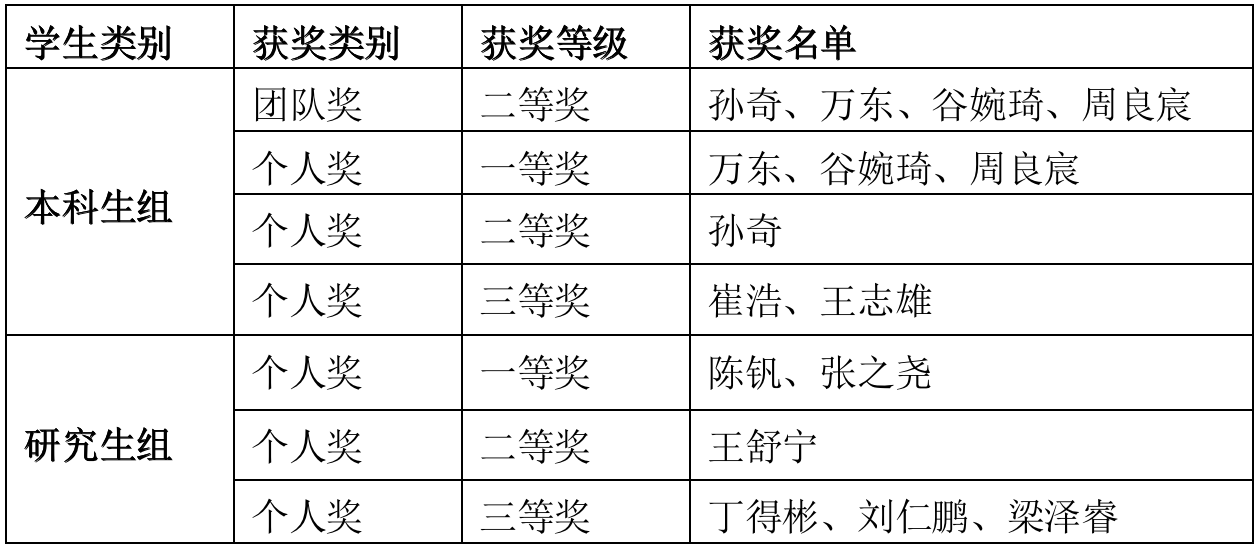 本科生组荣获团队二等奖1项,获得个人一等奖3项,个人二等奖1项,个人三等奖2项。