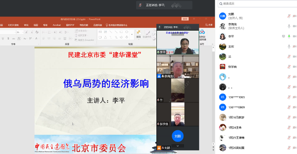 自今年2月25号开始的俄乌冲突,迄今已持续了一个多月,对包括我国在内的全球经济造成了很大影响,因此备受广大民众关注。4月7日晚,威廉体育williamhill金融系李平教授应邀给民建北京市委建华课堂就相关热点问题进行分析和交流,作题为“俄乌局势的经济影响”的线上专题讲座。