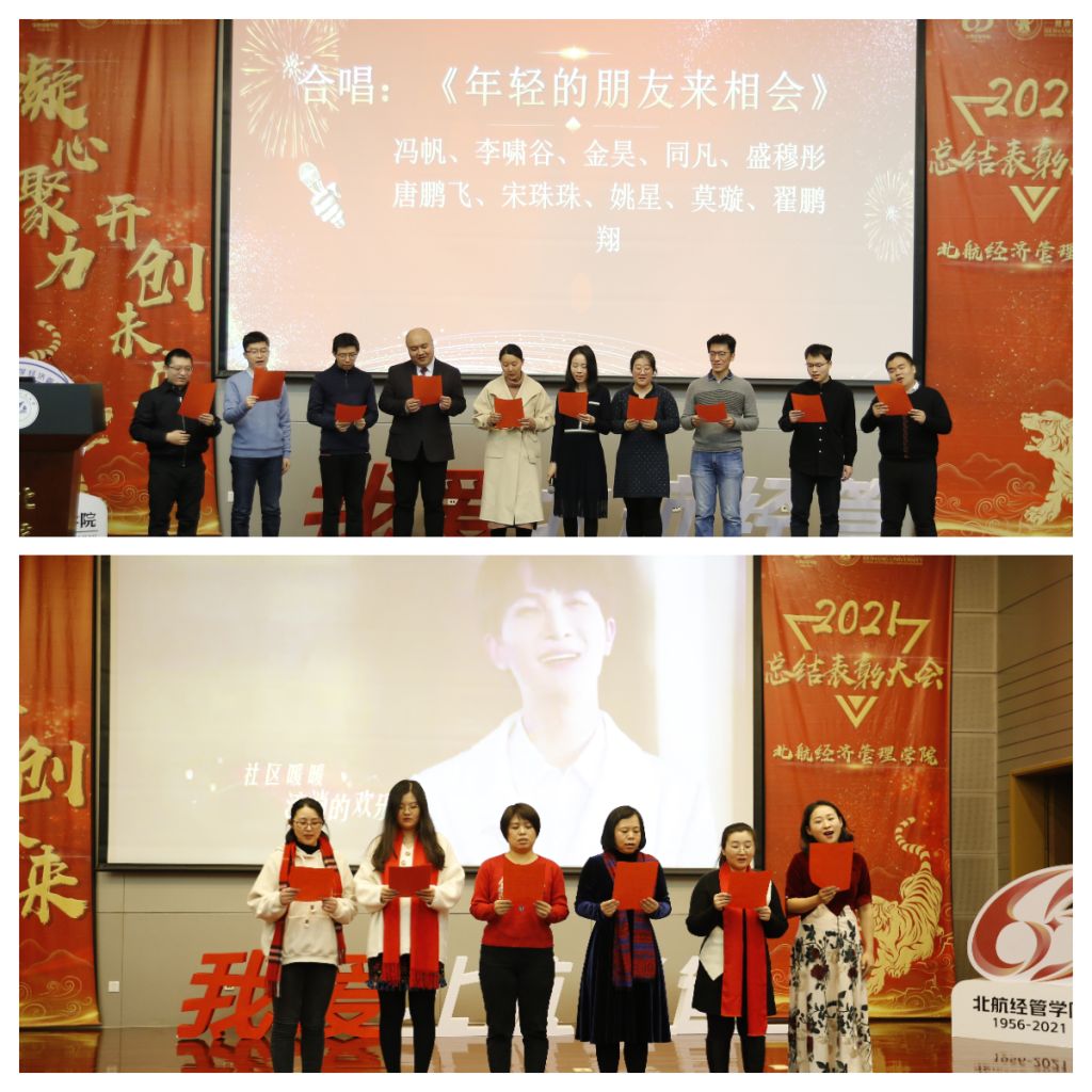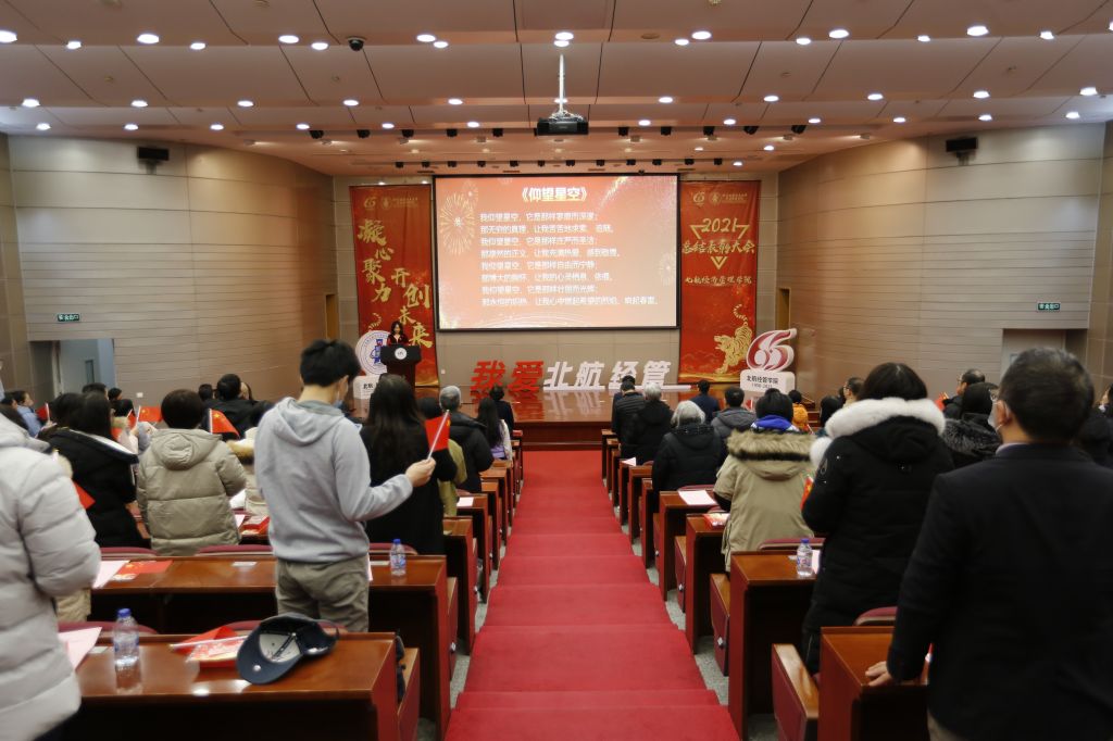 表彰会上,2021年度新进教师带来合唱《年轻的朋友来相会》。他们用奋进的歌词、昂扬的旋律诠释了青年教师蓬勃向上的精神风貌;获得管理服务之星的老师们用一首《灯火里的中国》,展现了公司教工对祖国的美好祝福以及对未来的欣然向往,将现场的热烈气氛推向高潮。最后,全院师生高声合唱北航校歌《仰望星空》,表彰大会圆满落下帷幕。