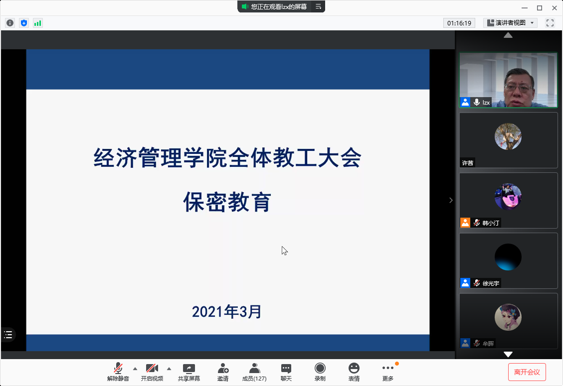 刘志新书记从严格落实保密责任,严格做好非密设备、非密网络保密管理,严格做好工作秘密、内部信息保密管理和稳步推进日常保密管理工作等方面为参会教职工开展了保密工作教育。