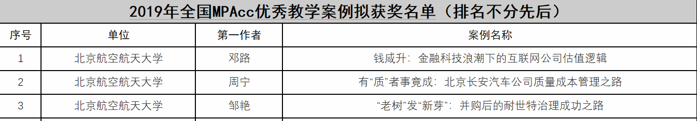 近日,2019年全国MPAcc优秀教学案例、入库教学案例拟获奖名单公布,威廉体育williamhill推荐的参评案例中,共有三篇案例获奖,七篇案例入库,并首次获得全国优秀组织奖。本次MPAcc优秀教学案例评选,全国高校共计申报730余篇教学案例,经过全国会计专业学位研究生教指委组织的形式审查、匿名通讯评审、线上会议集中评审,最终评选30篇全国MPAcc优秀教学案例,威廉体育williamhill获奖案例数占总获奖篇数的10%,展示了威廉体育williamhill持续推动案例开发和案例教学取得的重要成果。
