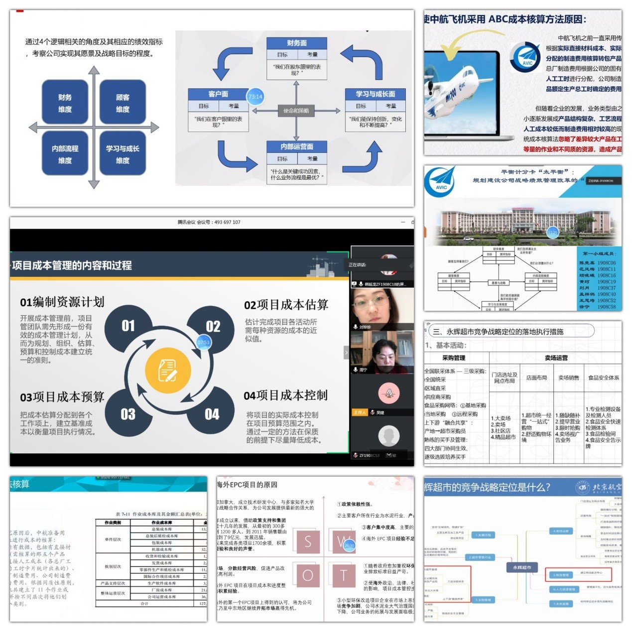 同时,在教学过程中,周老师两次邀请公司MBA员工进课堂,他们不仅是身经百战的企业管理者,还是荣获优秀案例的案例主人公——2013年全国第四届百优案例《平衡计分卡“太”平衡:规划建设公司战略绩效管理改革的“迷局”》的主人公匡婧和2017年全国MPAcc优秀案例《亡羊补牢,为时未晚:Z公司海外EPC项目成本管控艰辛之旅》的主人公刘珍珍。两位员工在腾讯会议中和同学们分享自己对案例的理解和体会,有多年实战经验的她们,对案例中所运用到的管理会计知识有更深刻的感悟和理解;她们还对各小组的汇报进行点评,指出亮点和不足。这种教学方式一方面加深了同学们对案例和理论知识的理解,另一方面也启发同学们思考如何更好地应理论知识指导实践的开展。