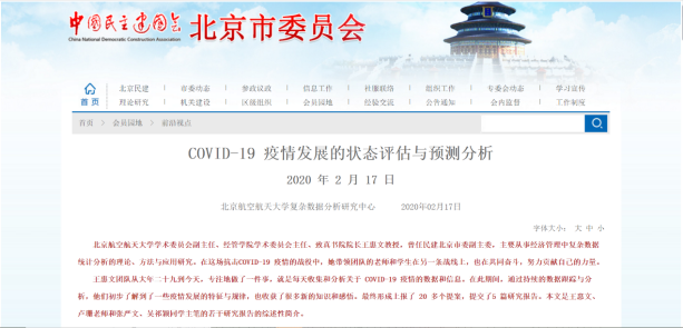 面对疫情,公司教师把后方当前线,积极献言建策。威廉希尔体育学术委员会副主任、威廉体育williamhill学术委员会主任、致真书院经理王惠文教授,在这场抗击疫情的战役中,带领团队的老师和员工每天收集和分析数据和信息。截至2月15日,王惠文教授撰写并提交了12篇关于抗击疫情的社情民意信息,其中,《关于考虑分期、分批恢复全国各地社会经济活动的建议》被民建中央综合采用,《新型冠状病毒肺炎疫情的状态评估和模拟预测研究》被中央统战部《零讯》采用。