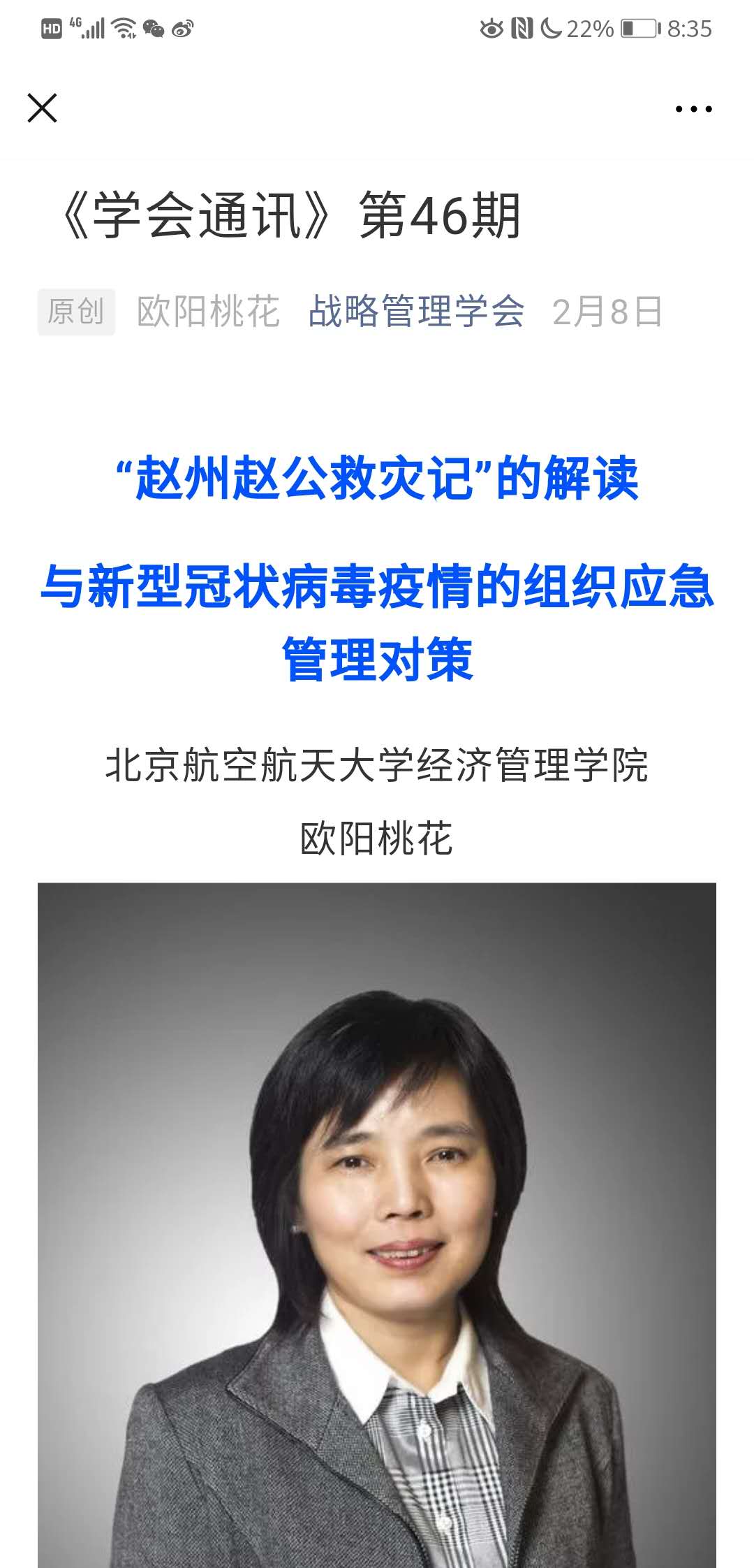 公司教师欧阳桃花,在战略管理学会发布专题文章“对‘赵州赵公救灾记’的解读,与新型冠状病毒疫情的组织应急管理对策”。通过解读古代灾情应急管理的佳文“赵州赵公救灾记”,结合新型冠状病毒疫情对组织的影响,提出三点看法:作为一个组织或者个人,要始终学习经典与最佳做法;提高应对突发危机事件的管理能力,关键是问对问题;提高应对突发危机事件的能力,信心、信赖、信用比黄金宝贵。