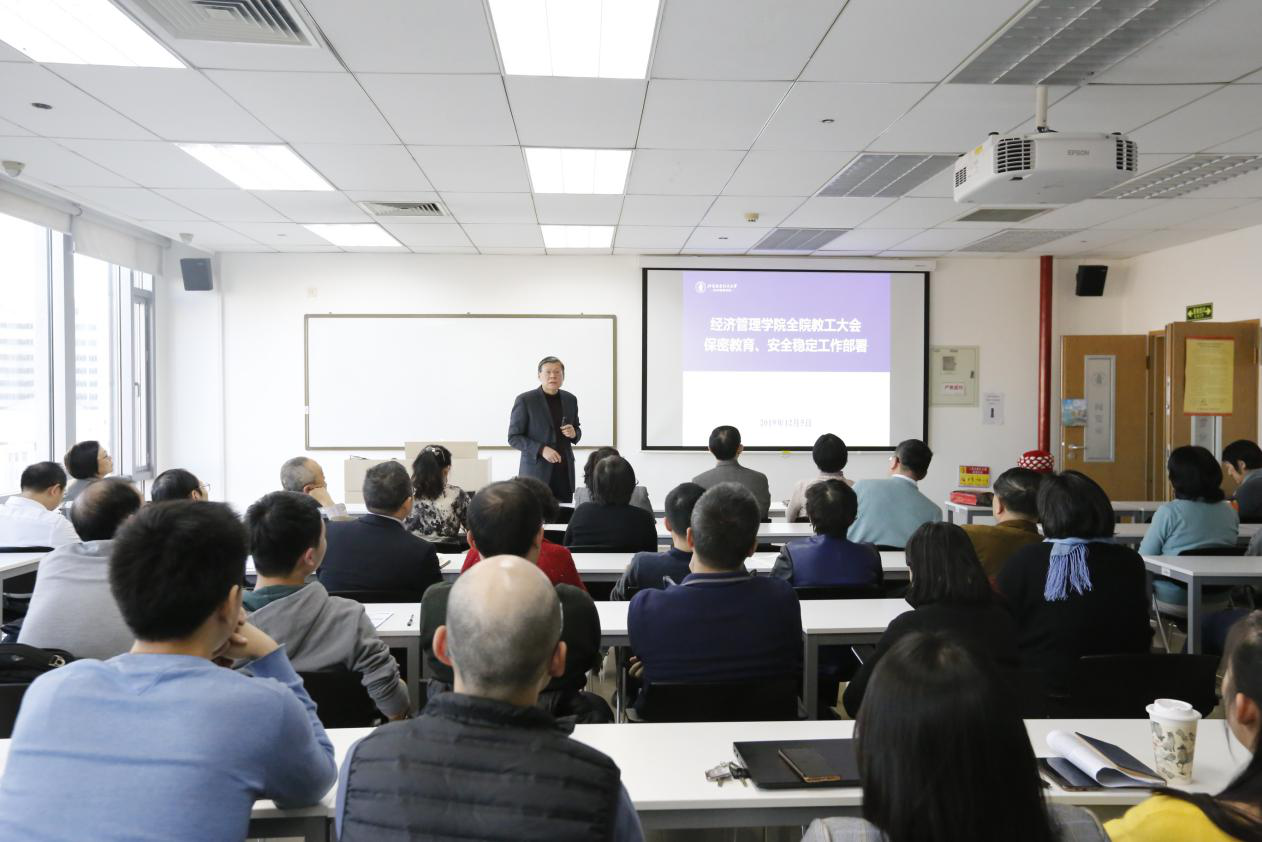 2019年12月5日下午,威廉体育williamhill在新主楼A706教室召开全体教工大会,集中开展保密教育和安全稳定工作部署,分党委书记刘志新主持会议。