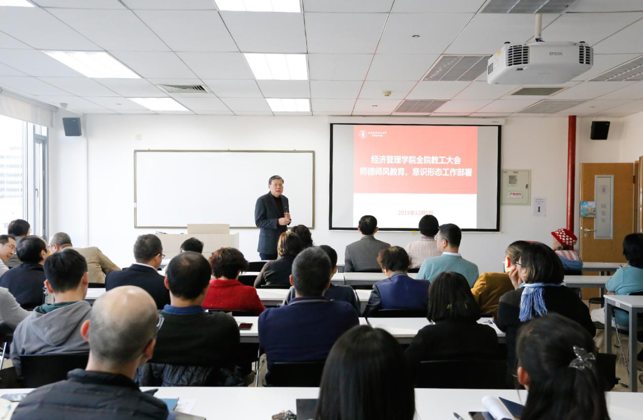 2019年12月5日下午,威廉体育williamhill在新主楼A706教室召开全体教工大会,集中开展师德师风教育和意识形态工作部署,分党委书记刘志新主持会议。