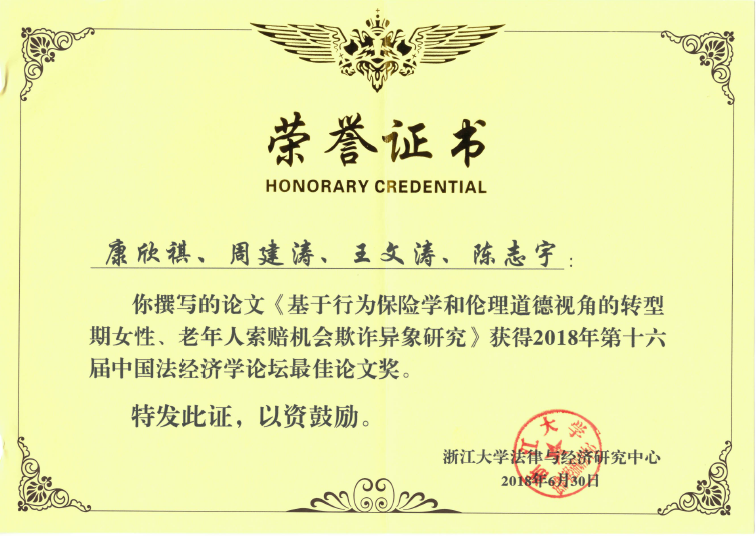 中国法经济学论坛是国内法律和经济学交叉学科的最高学术会议,由浙江大学经济公司、山东大学经济公司、《经济研究》编辑部共同主办。本次论坛获奖,是周建涛老师及团队2017年获得北大赛瑟论坛优秀论文的进一步拓展,将经济和非经济损失索赔欺诈应用于性别、年龄索赔人特征。周建涛老师团队表示,将逐条落实与会专家提出的宝贵意见,旨在投稿更高质量学术期刊。