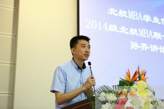 北航2014级MBA联合会主席孙齐作为员工代表,鼓励同学们要向社会导师看齐,感恩导师的每一次指导和实践经验的传授,在与社会导师沟通交流过程中,不仅要把基础理论知识应用到实践中,还要在与导师聊天中收到精神层面上的高层次领悟和启迪,共同将北航精神发扬下去。