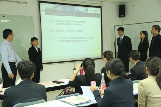 本学期开课后,苏老师考虑到脱产班在校时间长,且与MBA中心沟通较为频繁,为将教学计划更密切地结合实际,从而进一步巩固课堂所学,她特意安排一项题为“北航MBA发展建议书”的课后作业,并邀请MBA中心老师参与旁听课堂展示环节。