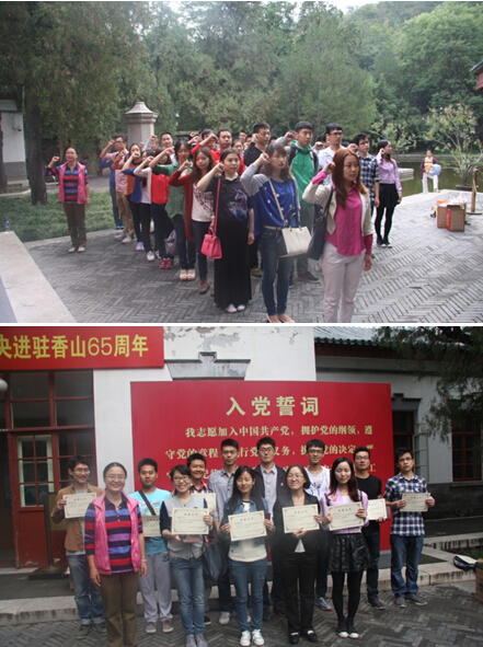 首先,在双清别墅讲解员的带领下,全体参会的新党员和优秀党员先后参观了毛泽东主席曾经生活和工作的地方。看着双清别墅陈列的物品和照片,在场的每一个人都感受到主席的艰苦朴素和雄韬伟略。参观结束之后,在牟晖老师的带领下,所有新党员面向党旗,庄严地宣誓,表达“为共产主义奋斗终身”的坚定信念。宣誓结束之后,牟晖老师和衣萌老师为2013—2014学年院级优秀党员颁发荣誉证书,对优秀党员在上一学年所开展的工作表示肯定,同时希望他们能继续发扬优良作风,做到不骄不躁。