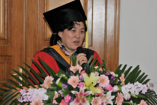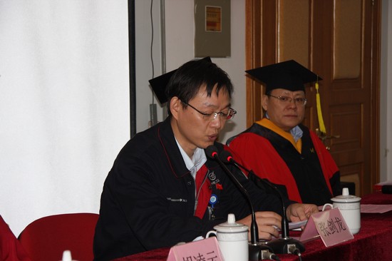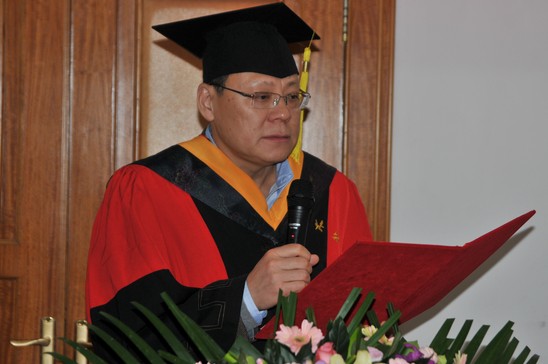 在雄壮的国歌声中,典礼仪式正式开始。刘大响院士宣布2012-2013年校级优秀硕士学位论文获得者及优秀硕士学位论文指导教师名单,并与胡凌云书记共同为优秀硕士学位论文获得者王毅和万力颁奖。