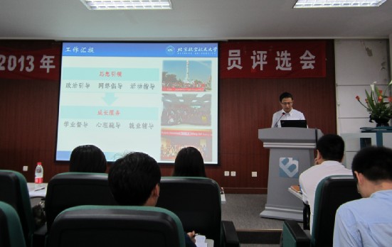 公司2010级硕士研究生辅导员牛伟宁、2011级硕士研究生辅导员张晓明、2012级硕士研究生辅导员王腾飞经公司推荐,在ihome网上投票以及各公司研究生指导主任(副书记)对文字材料打分中脱颖而出,成为进入答辩程序的20个辅导员中的一员。答辩会上,牛伟宁从院校活动、奖学金评审、毕业生就业、课题参与全面介绍自己一年来的工作;张晓明本着引导为主、沟通为辅的思路,汇报了主要负责的普硕、专硕党建、日常管理、分研会指导工作;王腾飞以“思想引领、成长服务”为主线,从政治引导、网络倡导、活动指导、学业督导、心理疏导、就业辅导六个方面向评委介绍自己的工作。答辩过程中,公司辅导员充分展现自身风采,详实回答评委提问,赢得了阵阵掌声。最终2011级硕士研究生辅导员张晓明、2012级硕士研究生辅导员王腾飞获得“2012-2013 研究生辅导员年度标兵”称号,2010级硕士研究生辅导员牛伟宁获得“优秀研究生辅导员”称号。