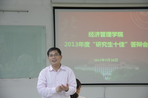 答辩会由欧阳老师主持,首先介绍了到场领导及老师,具体说明了答辩环节流程及注意事项,接着请牟晖老师解释了此次答辩的评分标准、奖项设置。每位同学的答辩由两个环节组成,第一环节,每位候选同学准备了介绍自我情况的PPT文件,结合文字、图片非常生动地为在场所有老师和同学展示了自己在学习、科研、文体活动、志愿服务、社会工作几方面的表现。第二环节,由在场评委老师对同学进行提问。答辩环节结束后方经理为此次评选答辩总结道,研究生十佳是全面发展的,在注重学习、科研的同时也应当均衡锻炼实践能力,希望经过今天的交流,同学之间通过互相学习也有所收获,争取取得更大的进步。