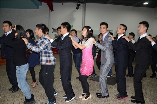 这场热烈的舞会上,大家先是欣赏了街舞社的精彩表演,然后身着盛装的同学们纷纷上台,迈起轻盈的舞步,配合音乐跳起了华尔兹,身着西服的男生和裙装的女生构成了一幅亮丽的风景。在舞会进行同时,大家共同举杯,尽情畅谈,并欣赏11级王晗、许旸带来的拉丁舞蹈。组织方还别出心裁的组织了一个小游戏,分别用扭秧歌、江南style、猴哥、第二套广播体操、掀起你的盖头来等独特搞笑的舞蹈随机抽取并模仿表演,邀请在场所有人员上台表演,他们也各显才艺,为大家演绎了一段段风格各异的舞蹈,引来在场同学阵阵的欢呼和笑声。最后,王经理上台做了简短的总结讲话,对此次舞会做出了高度的评价。整台舞会在大家集体跳兔子舞中结束,全场弥漫着青春的气蕴。