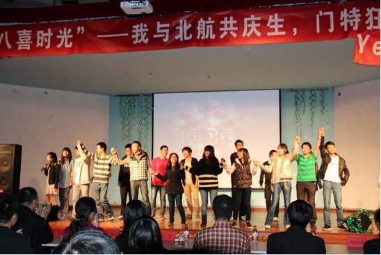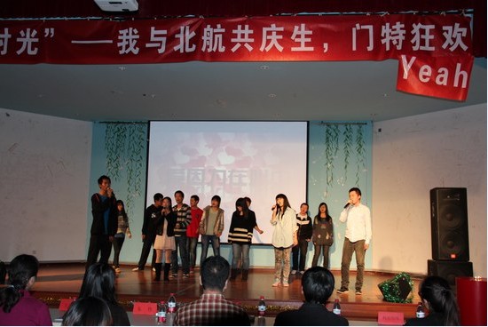 最后,晚会的重头戏——我与北航共庆生精彩呈现。晚会为所有10月生日的老师、同学献上了特别的礼物。王经理位列其中,再一次被深深感动的同时,也传播着感动,她号召同学们互相拥抱,大声呼唤“友谊万岁!”。精彩中的精彩却是是大家一起跳起“江南style”,经理等各位公司领导、辅导员的舞姿赢得不断喝彩!