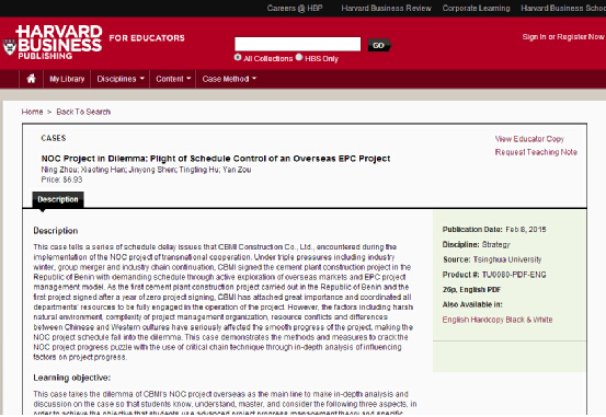 公司周宁教授团队撰写的《有米难为炊的NOC项目:海外EPC工程进度控制的困境》(英文题目:NOC Project in Dilemma: Plight of Schedule Control of an Overseas EPC Project)案例被哈佛案例库收录,正式出版发行。