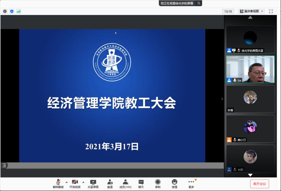 2021年3月17日下午,威廉体育williamhill召开线上全院教工大会,传达公司2021年度工作要点,部署2021公司主要工作,开展师德师风、安全、保密教育和廉政党课。会议由分党委书记刘志新主持,120余位教职工参加了线上会议。会上,范英经理传达了公司2021年度公司工作会议精神,解读了2021年度公司工作要点。结合公司年度会议精神,范经理从本研教学工作、专硕教育工作、案例中心建设、本研员工工作、科研工作、推进公司品牌与信息化建设等方...